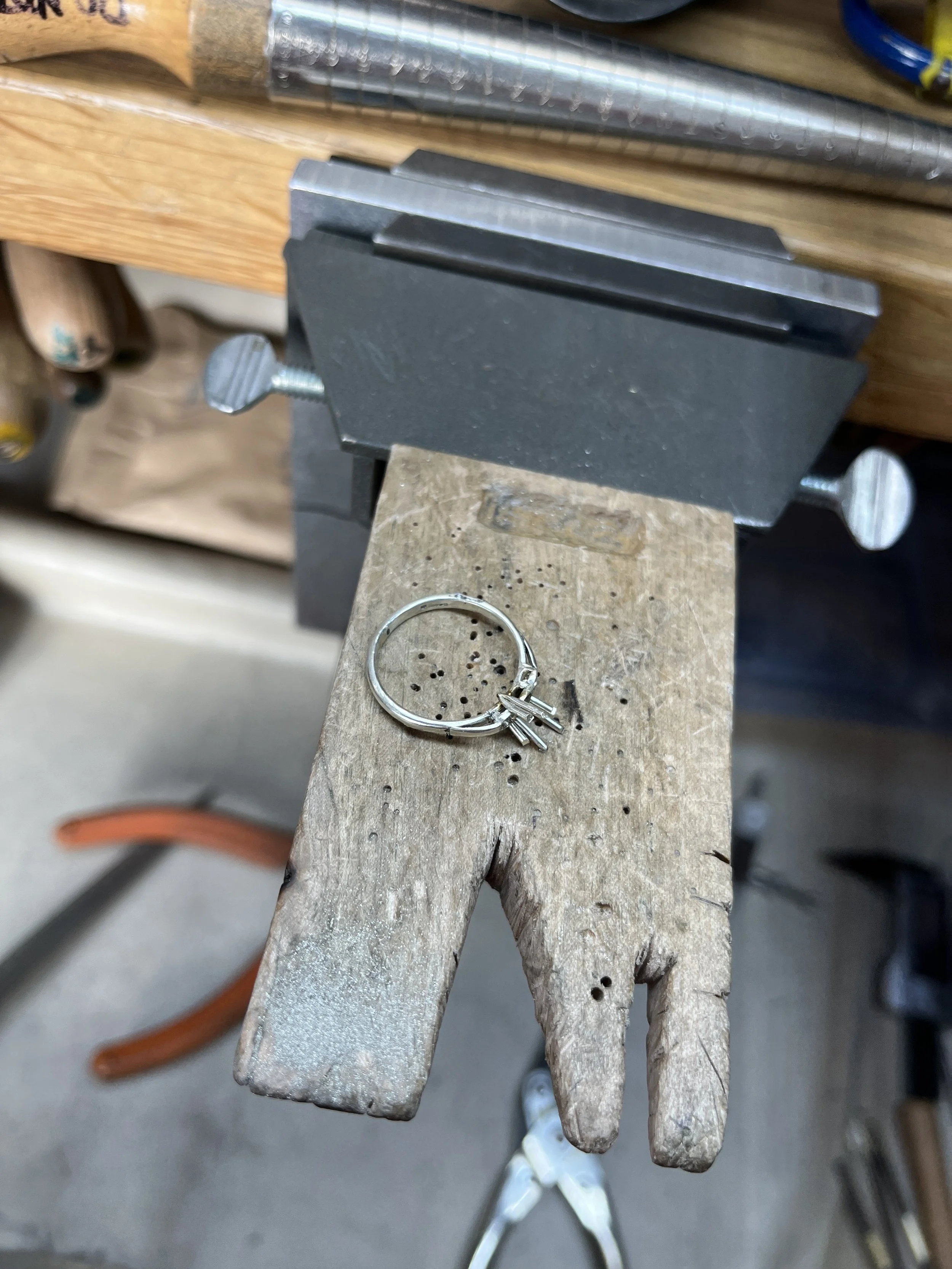 We used 3 of the diamonds to symbolise the 3 generations in a traditional setting that will last for years to come. This is all hand fabricated as each diamond was completley unique and had odd geometric dimentions.