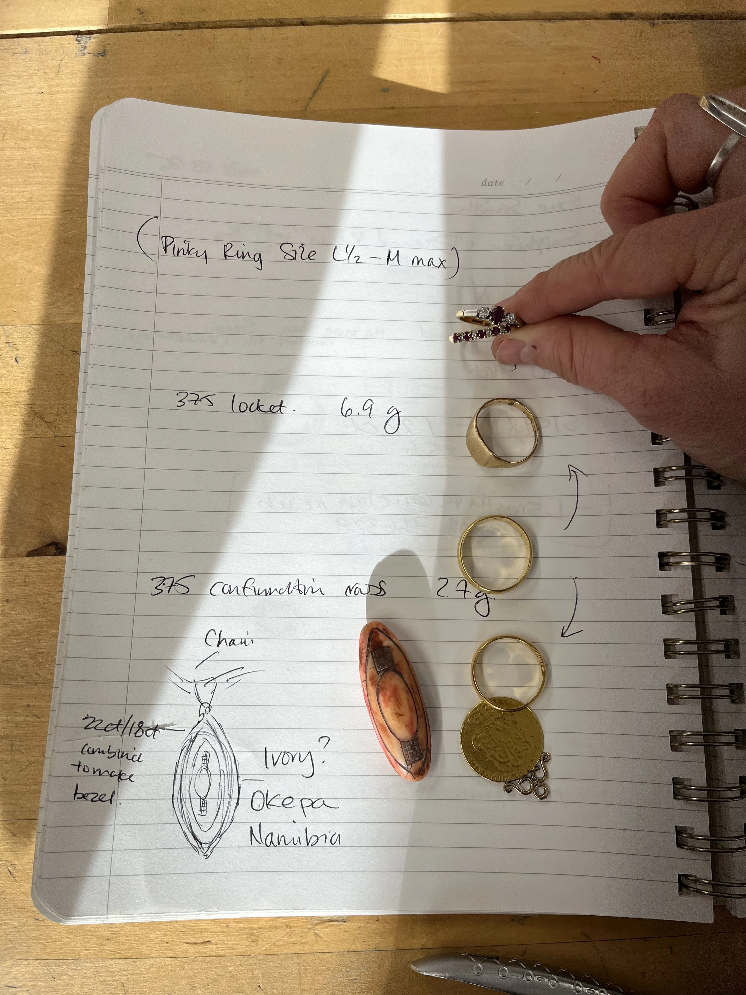This bead was brought to me by Cath, she wanted to use heirloom gold and rings to make 2 remodels this was the first I worked on. It was a simple request but needed quite a bit of care in how it was handled and set. The Okepa bead I believe could have been made of bone, which was dyed with a red colour and needed to be carfully ground down to make it more of a cabochon for settting.