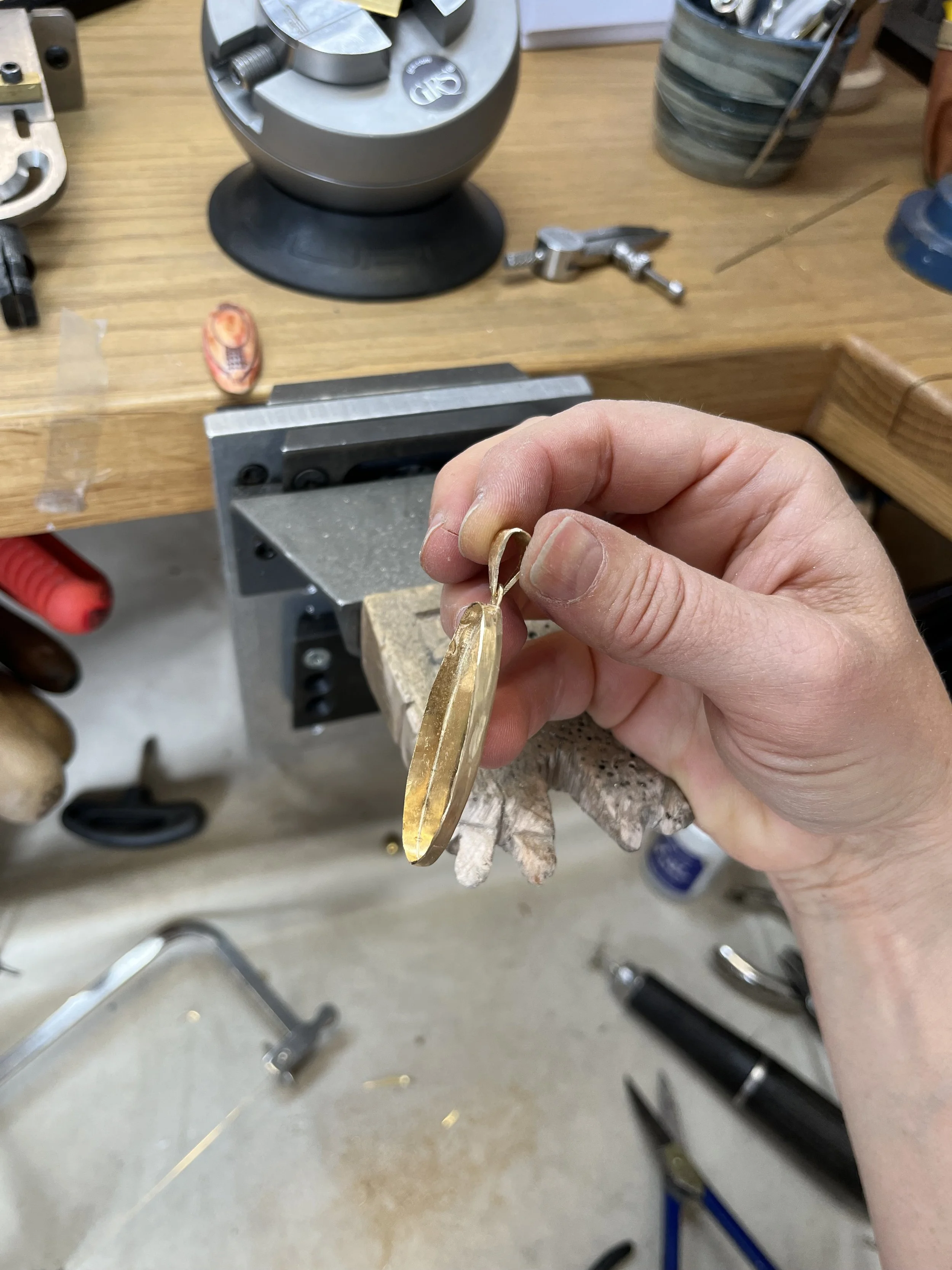 The gold was many items melted down and forged out to make sheet I could use for the mounting. When remelting gold in a studio setting there is always the chance on misphaps and issues with cracking and pits. You can see how I had to carefully avoid these areads when I made my cuts. The Dado2 was fabulous for helping me tack weld the unweilding large bezel before soldering.